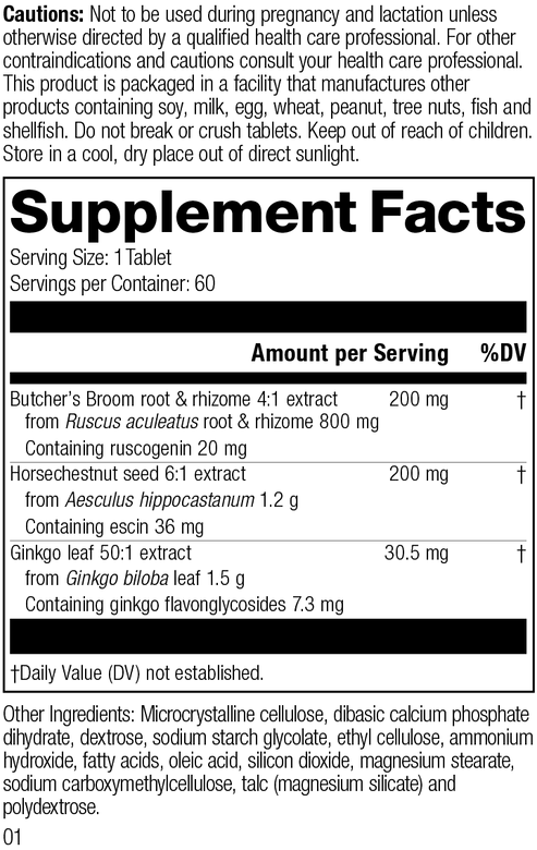 Each Serving Size (1 Tablet) contains: Butcher’s Broom root & rhizome 4:1 extract 200 mg (from Ruscus aculeatus root & rhizome 800 mg, Containing ruscogenin 20 mg), Horsechestnut seed 6:1 extract 200 mg (from Aesculus hippocastanum seed 1.2 g, Containing escin 36 mg), Ginkgo leaf 50:1 extract 30.5 mg (from Ginkgo biloba leaf 1.5 g, Containing ginkgo flavonglycosides 7.3 mg). Other Ingredients: Microcrystalline cellulose, dibasic calcium phosphate dihydrate, dextrose, sodium starch glycolate, ethyl cellulose, ammonium hydroxide, fatty acids, oleic acid, silicon dioxide, magnesium stearate, sodium carboxymethylcellulose, talc (magnesium silicate) and polydextrose.