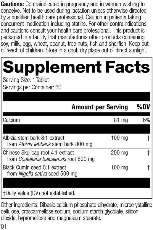 Each Serving Size (1 Tablet) contains: Calcium 81 mg, Albizia stem bark 8:1 extract 100 mg (from Albizia lebbeck stem bark 800 mg), Chinese Skullcap root 4:1 extract 200 mg (from Scutellaria baicalensis root 800 mg), Black Cumin seed 5:1 extract 100 mg (from Nigella sativa seed 500 mg). Other Ingredients: Dibasic calcium phosphate dihydrate, microcrystalline cellulose, croscarmellose sodium, sodium starch glycolate, silicon dioxide, hypromellose and magnesium stearate.