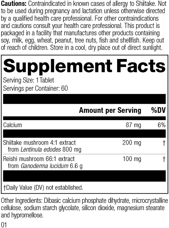 Each Serving Size (1 Tablet) contains: Calcium 87 mg, Shiitake mushroom 4:1 extract 200 mg (from Lentinula edodes 800 mg), Reishi mushroom 66:1 extract 100 mg (from Ganoderma lucidum 6.6 g). Other Ingredients: Dibasic calcium phosphate dihydrate, microcrystalline cellulose, sodium starch glycolate, silicon dioxide, magnesium stearate and hypromellose.