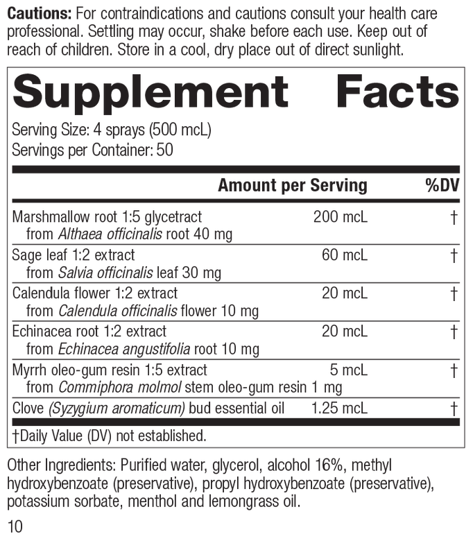 Each Serving Size (4 sprays (500 mcL)) contains: Marshmallow root 1:5 glycetract 200 mcL (from Althaea officinalis root 40 mg), Sage leaf 1:2 extract 60 mcL (from Salvia officinalis leaf 30 mg), Calendula flower 1:2 extract 20 mcL (from Calendula officinalis flower 10 mg), Echinacea root 1:2 extract 20 mcL (from Echinacea angustifolia root 10 mg), Myrrh oleo-gum resin 1:5 extract 5 mcL (from Commiphora molmol stem oleo-gum resin 1 mg), Clove (Syzygium aromaticum) bud essential oil 1.25 mcL. Other Ingredients: Purified water, glycerol, alcohol 16%, methyl hydroxybenzoate (preservative), propyl hydroxybenzoate (preservative), potassium sorbate, menthol and lemongrass oil.