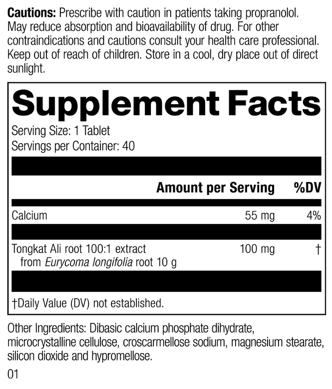 Each serving size (1 tablet) contains: Calcium 55 mg, Tongkat Ali root 100:1 extract 100 mg (from Eurycoma longifolia), dibasic calcium phosphate dihydrate, microcrystalline cellulose, croscarmellose sodium, magnesium stearate, silicon dioxide and hypromellose.