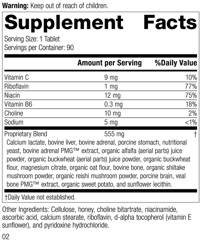 Each Serving Size (1 Tablet) contains: Vitamin C 9 mg, Riboflavin 1 mg , Niacin 12 mg, Vitamin B6 0.3 mg, Choline 10 mg, Sodium 5 mg. Proprietary Blend 555 mg: Calcium lactate, bovine liver, bovine adrenal, porcine stomach, nutritional yeast, bovine adrenal PMG™ extract, organic alfalfa (aerial parts) juice powder, organic buckwheat (aerial parts) juice powder, organic buckwheat flour, magnesium citrate, organic oat flour, bovine bone, organic shiitake mushroom powder, organic reishi mushroom powder, porcine brain, veal bone PMG™ extract, organic sweet potato, and sunflower lecithin. Other Ingredients: Cellulose, honey, choline bitartrate, niacinamide, ascorbic acid, calcium stearate, riboflavin, d-alpha tocopherol (vitamin E sunflower), and pyridoxine hydrochloride.