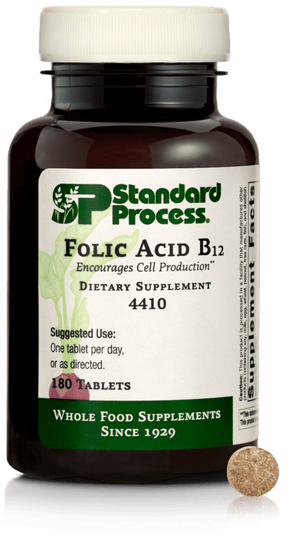 Each Serving Size (1 Tablet) contains: Folate (400 mcg folic acid) 665 mcg DFE, Vitamin B12 6 mcg. Proprietary Blend 350 mg: Calcium lactate, bovine liver, organic carrot, organic sweet potato, porcine stomach parenchyma, defatted wheat germ, bovine spleen, ovine spleen, bovine adrenal Cytosol™ extract, oat flour, and ascorbic acid. Other Ingredients: Honey, dicalcium phosphate, cellulose, folic acid, and cyanocobalamin.
