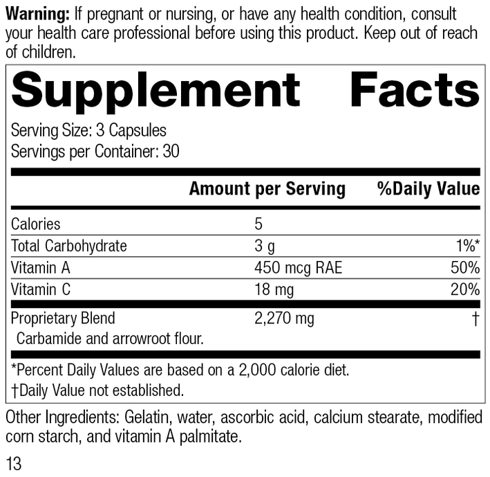 Each Serving Size (3 Capsules) contains: Calories 5, Total carbohydrate 3 g, Vitamin A 450 mcg RAE, Vitamin C 18 mg. Proprietary Blend 2,270 mg: Carbamide and arrowroot flour. Other Ingredients: Gelatin, water, ascorbic acid, calcium stearate, modified corn starch, and vitamin A palmitate.